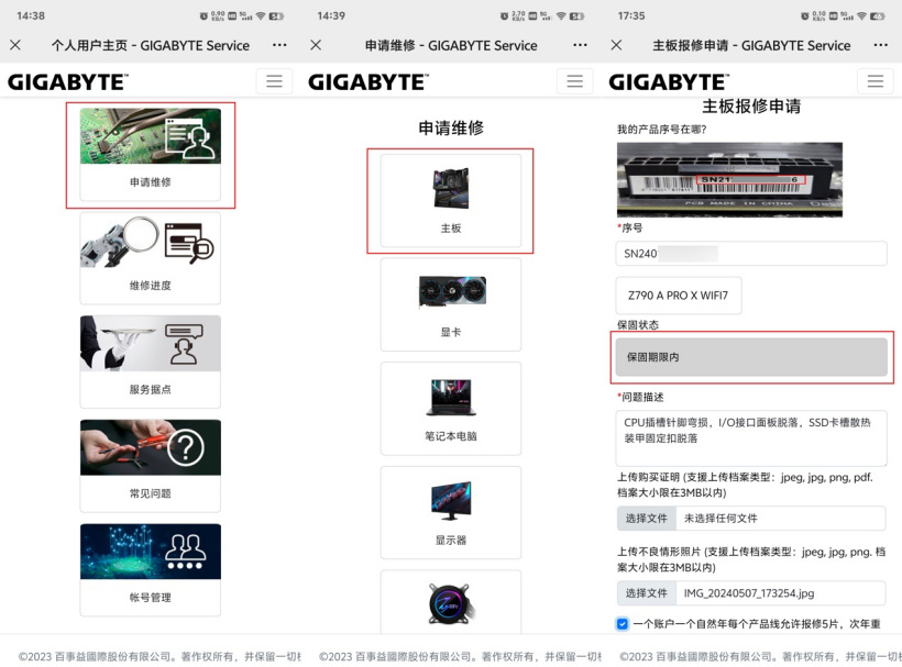 注册好之后,点击公众号底部的产品报修,会进入上图最左边的页面,继续点击申请维修,二级页面会让你选择维修的硬件类型,我们这里选择主板,然后出现了主板报修申请的表单,需要填写产品序列号,出现的问题以及上传产品外观图片。不过,购买凭证并不是必填项目,省事了不少。输入序列号后,产品的型号会自动录入,保修状态也会自动查询并显示出来,我的主板很明显还在保修期内。