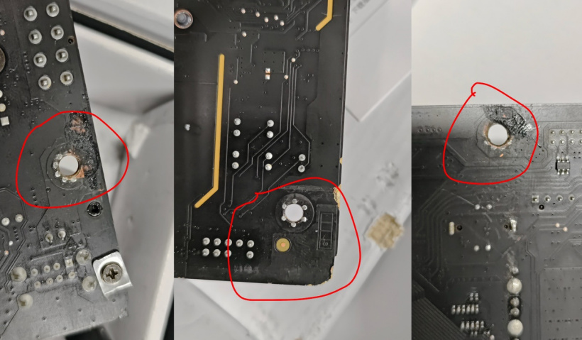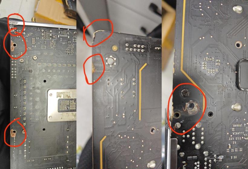 我询问对方是否还能进行维修,工程师表示,技嘉是支持个损帮修的,可以帮我维修,今天他先帮我看看 CPU 针脚和功能性问题,能点亮机器再说,我说没问题。为方便沟通,对方加了我的微信,并给我发来了 PCB 损伤部位的图片。
