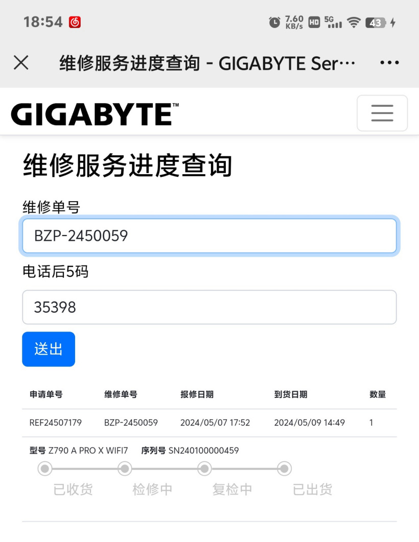 当然,等待维修的过程中,也可以随时在 AORUS 俱乐部小程序上面,查询产品送修的状态,上图中可以看到,我们是 5 月 7 号下午 5 点 52 分寄出的,5 月 9 号中午,售后服务中心收就收到了我们的包裹。