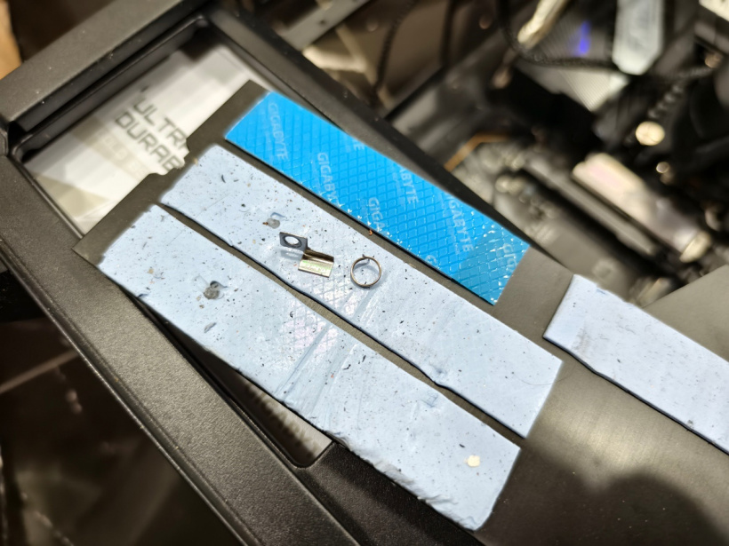 随后我把主板从机箱内取出查看,才发现出了大问题。首先,散热装甲的 M.2 插槽固定扣直接断掉了,没法再固定在主板上,等于下面的 3 个副 M.2 硬盘都没有了散热保护措施。