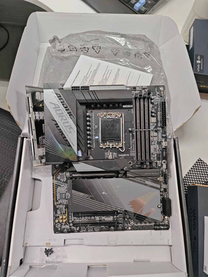 前些日子搬了趟家,因为时间比较着急,在打包家里台式机的时候明明已经把主板上的东西都拆下装好,可唯独忘了将主板从机箱里取出来,于是收到快递后不出意外地翻车了。我手上这块主板是技嘉的 Z790 电竞雕 X,支持 Wi-Fi 7 的版本,属于比较新的型号,大家记住这句话,后面会再次提到。