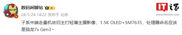 IT之家 5 月 24 日消息,博主 @数码闲聊站 今日爆料,小米 Redmi 新机主打轻薄主摄影像,配备 1.5K OLED 显示屏 + SM7635 处理器(IT之家注:骁龙 7s Gen3)。