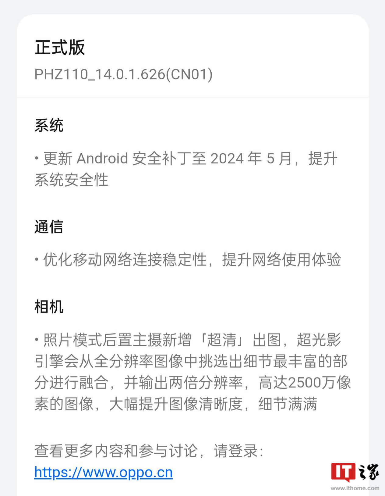 IT之家 5 月 25 日消息,据IT之家小伙伴投稿,今天 OPPO 为旗下 OPPO Find X7 手机推送 ColorOS 14.0.1.626 版本更新,该版本包体积为 942.06MB,附带谷歌 5 月安全补丁,主要为手机的相机功能带来了合成输出“两倍分辨率照片(25MP)”特性。