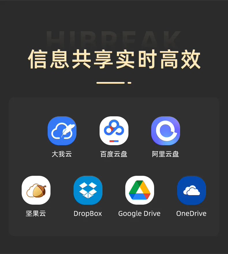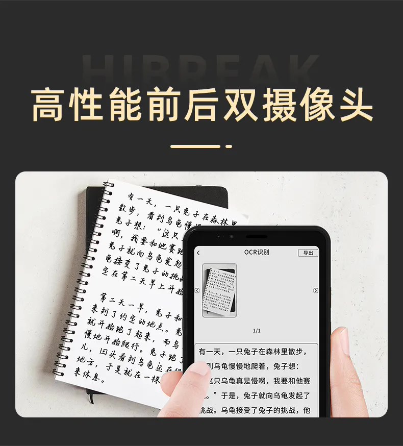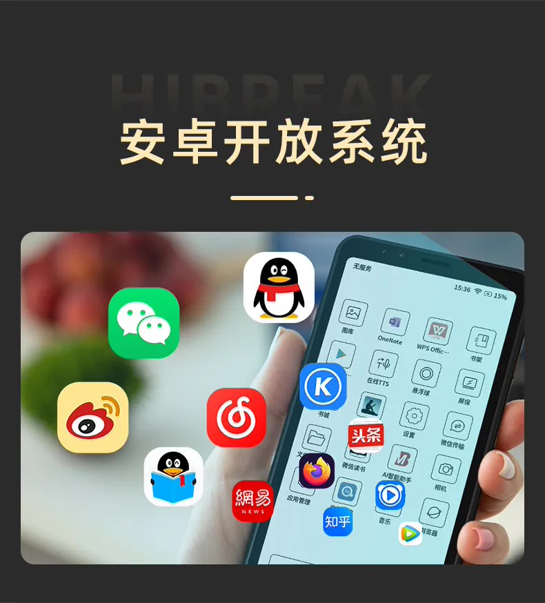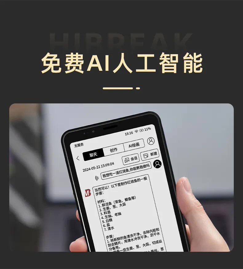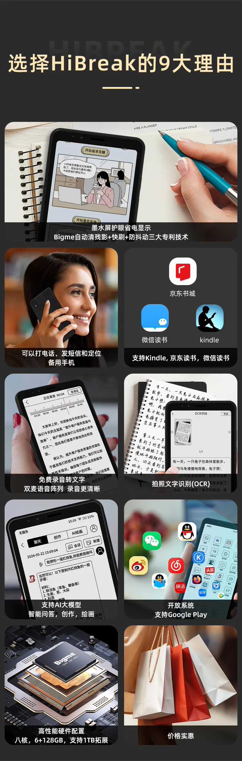 HiBreak 墨水屏手机预支持大我云、百度云盘、阿里云盘等 7 大主流云盘;支持免费录音转文字;内置免费 AI 人工智能,支持智能总结、聊天、创作、绘画等能力;预装京东读书、微信读书和 Kindle 三大书城。
