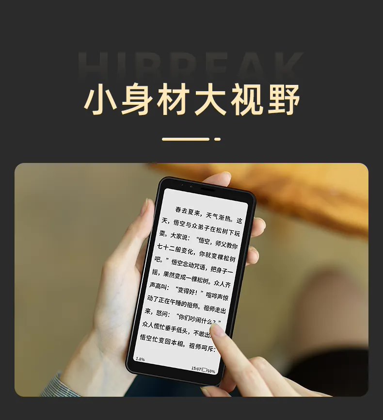 Bigme 大我墨水屏手机 HiBreak 配备 5.84 英寸彩色 / 黑白墨水屏,采用全面屏设计,重量约 170g。