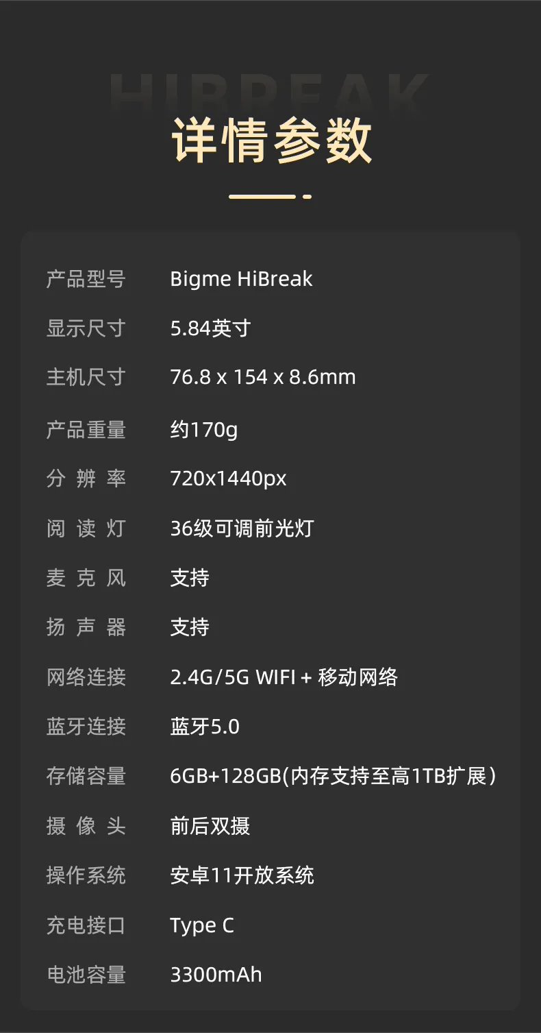 此次 Bigme 大我墨水屏手机 HiBreak 首发版本搭载 MTK6765 处理器,配备 6GB+128GB 内存组合,预装安卓 11 系统。