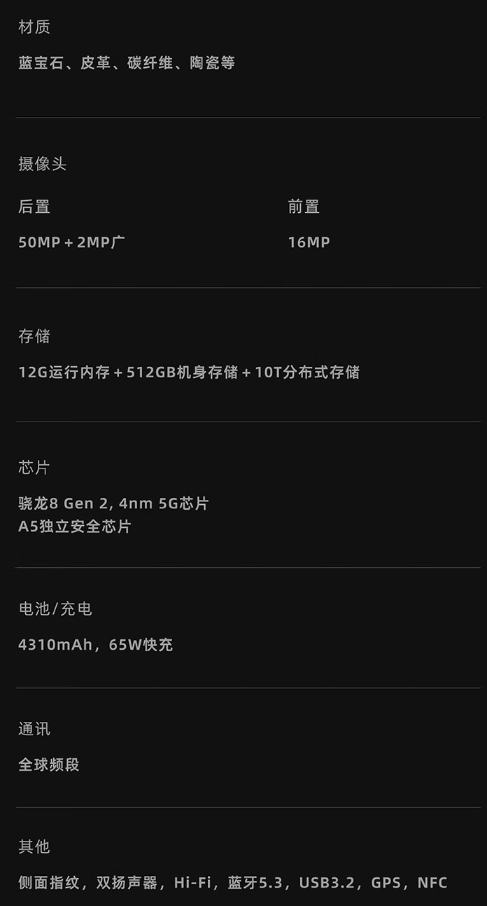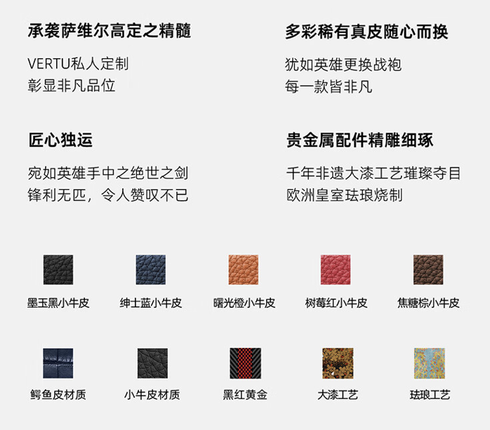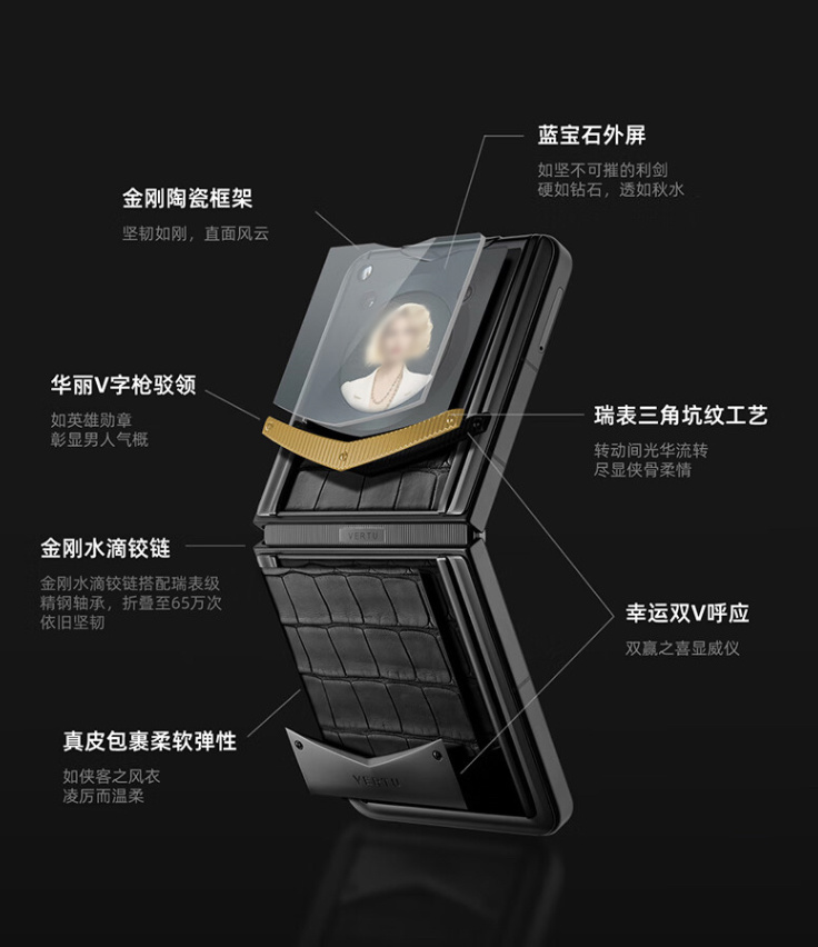 外观方面,该机搭载金刚陶瓷框架 + 金刚水滴铰链,号称可以折叠 65 万次;同时配备瑞表三角坑纹工艺,机身覆盖真皮材质,同时遵循了 Vertu 一贯相传的 V 形“ID”设计。