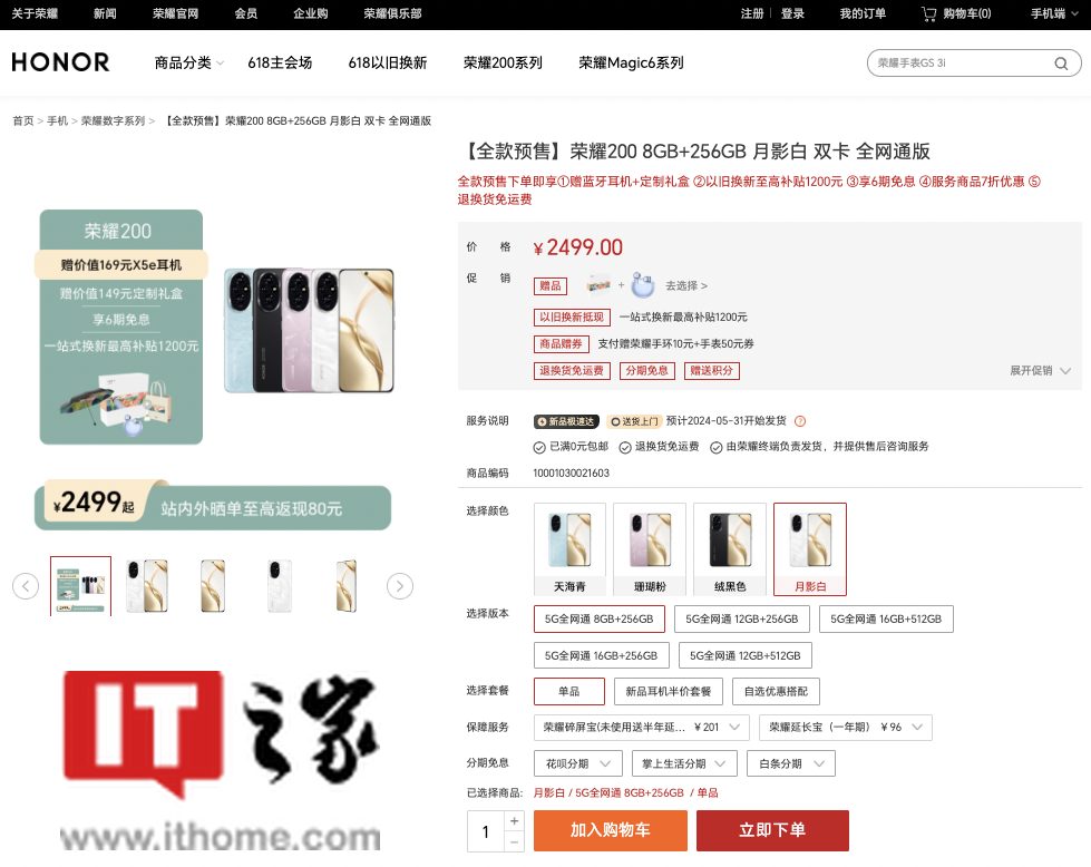 文章来源于互联网:IT之家-线上专供,荣耀 200 手机提供 8+256GB 配置 2499 元