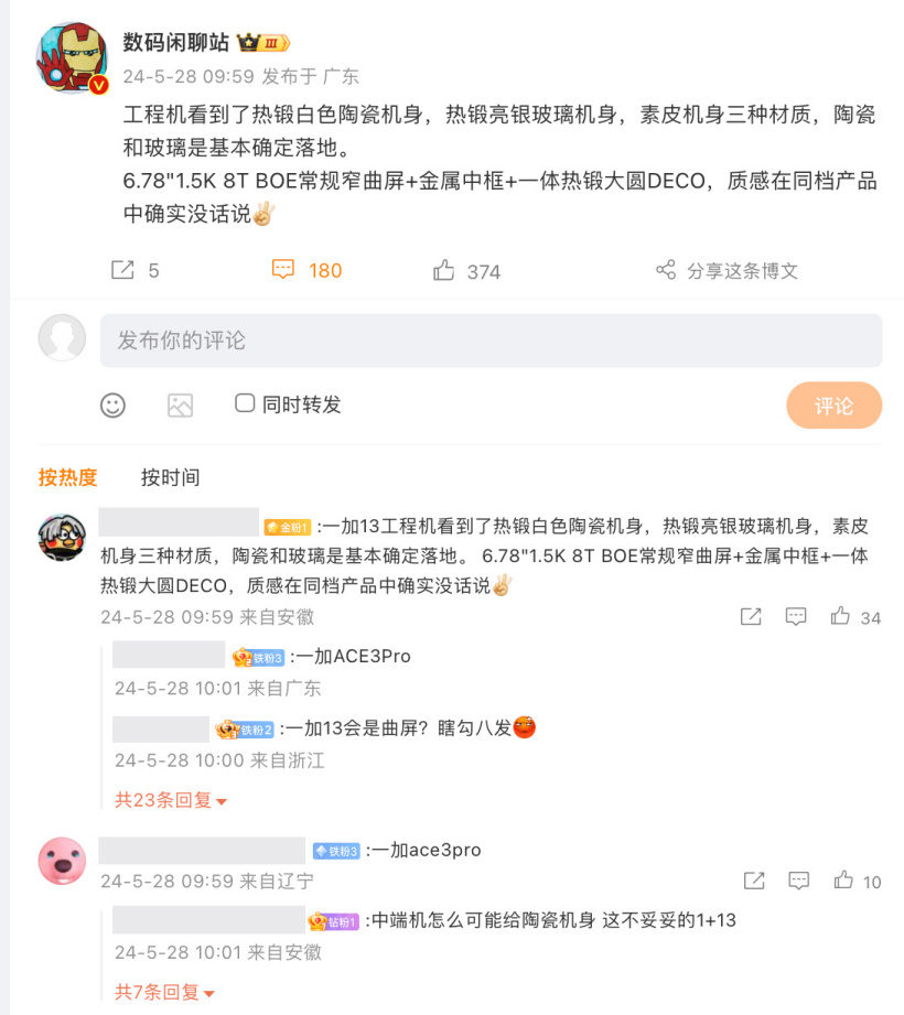 评论区存在两种声音,一种声音认为该机是一加 Ace 3 Pro,一种声音认为该机是一加 13,不过IT之家综合对比此前报道的系列手机参数,这款新机有望为一加 Ace 3 Pro(此前消息称一加 13 为 2K 微曲屏)。