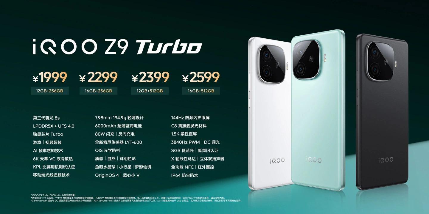 iQOO Z9 Turbo 手机发布于 4 月 29 日,搭载骁龙 8s Gen3 处理器,12+256GB 版本发售价 1999 元,12+512GB 版本发售价 2399 元。