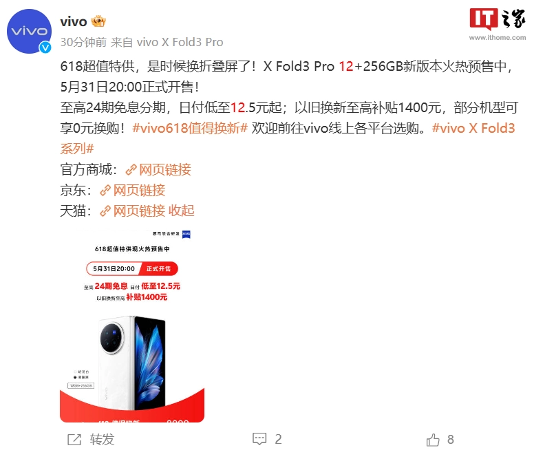 文章来源于互联网:IT之家-618 专享,vivo X Fold3 Pro 折叠屏手机 12+256GB 开启预售 8999 元