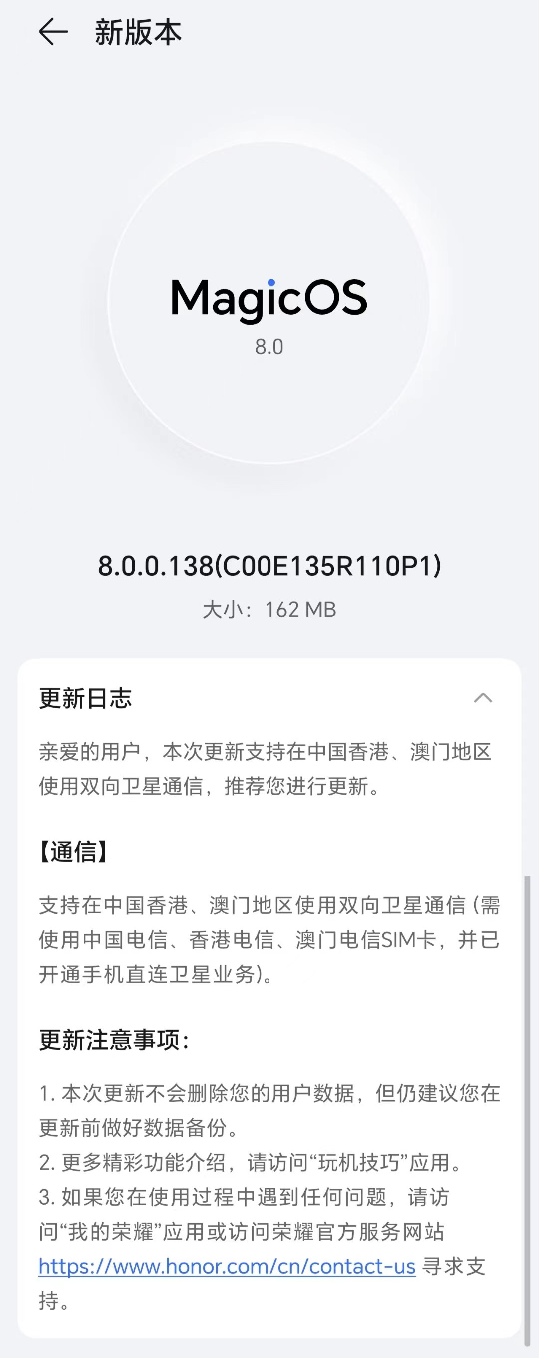 IT之家 5 月 28 日消息,荣耀 Magic 6 系列手机获推 MagicOS8.0.0.138(C00E135R110P1)更新,此次更新支持中国香港、澳门地区双向卫星通信,系统包大小约 162MB。