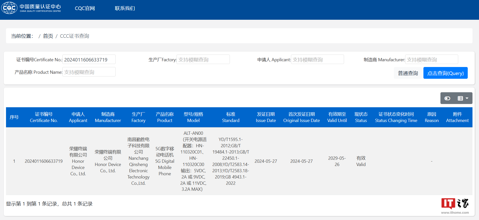 IT之家 5 月 28 日消息,中国质量认证中心网站显示,型号为 ALT-AN00 的荣耀 5G 手机新品通过国家质量认证。