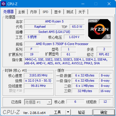 AMD 这边的 R5-7500F 采用台积电 5nm FinFET 工艺。核心规模也是 6 核心 12 线程,6MB 二级缓存和 32MB 三级缓存,基础频率 3.2 GHz。两款 CPU 的 TDP 均为 65W。