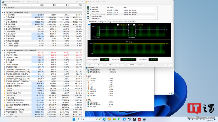 相比之下,R5-7500F 这边就比较激进了,功耗飙到了 95w,温度也来到了 80℃。