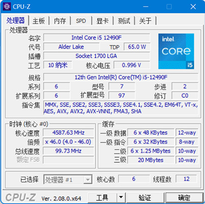我们先来看看两款 CPU 的核心参数,我们测试的 i5-12490F 配备了 6 个 P 核心和 12 个线程。在 CPU-Z 中,我们可以看到更详细的参数,i5-12490F 拥有 7.5MB 的二级缓存,和 20MB 的三级缓存,最高频率为 4.58GHz。