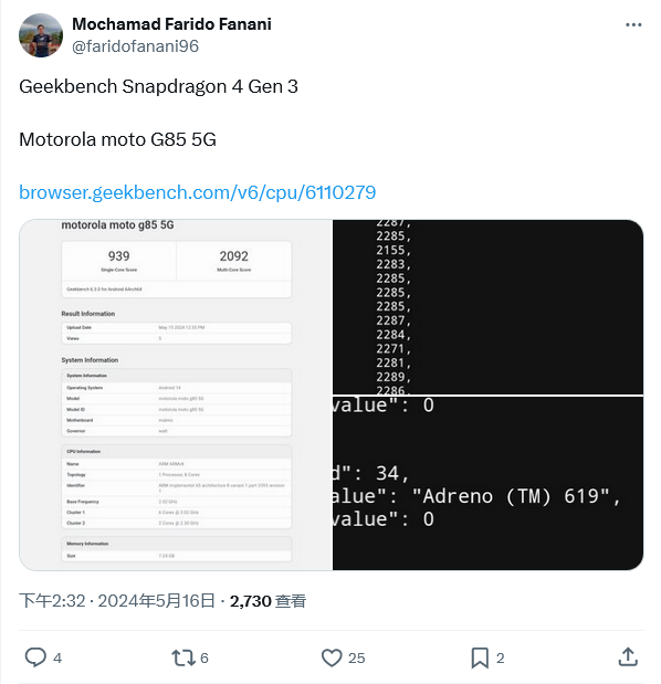 上述规格中处理器可能存在争议,此前 GeekBench 跑分库数据显示摩托罗拉 Moto G85 5G 手机显示采用高通骁龙 4 Gen 3 处理器。