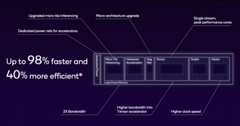 具体来说,在第三代骁龙 8 平台上,高通 AI 引擎进一步做了积极的革新,高通将过去的 Hexagon 张量加速器升级为 Hexagon NPU,从而可以协调整个平台。同时 Hexagon NPU 本身也升级了新的微架构,比前代的推理速度快 98%,能效提升了 40%。