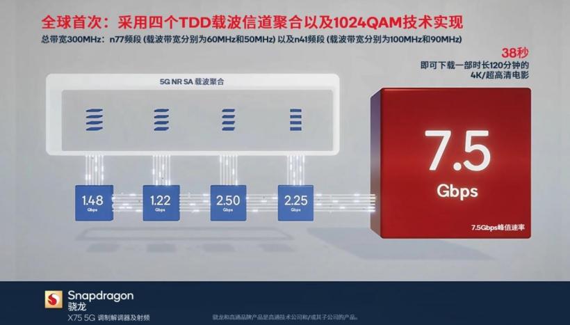 除了上面这些,第三代骁龙 8 移动平台还在其他方面为这些旗舰手机的强大体验提供支持,比如在通信方面,第三代骁龙 8 内置了全新的骁龙 X75 调制解调器,这是全球首个 5G Advanced-ready 调制解调器及射频系统,更在业界首次采用了专用硬件张量加速器,峰值下载速率可达 10Gbps、上传 3.5Gbps。而在 Wi-Fi 方面则搭载了 FastConnect 7800 移动连接系统,支持 Wi-Fi 7,尤其是高通专有的 HBS 高频并发技术,峰值速度高达 7.8Gbps。而在 iQOO 12 Pro 上则可以实现四网并发,500M W-Fi 平均下载速率提升 68%,平均下载用时缩短 41%。