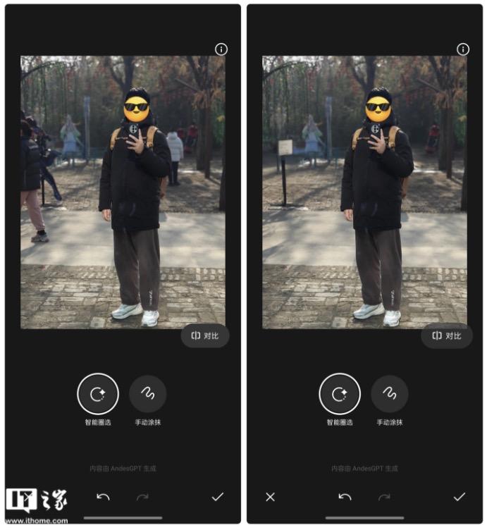 在相册中,找到选择编辑,找到 AIGC 按钮,即可进入“消除”界面,你可以手动圈住要消除的画面,随后交给系统即可。IT之家也做了体验,Find X7 系列在 AIGC 消除能力方面表现出色,效果甚至不逊于一些专业的 PS 软件。更重要的是,它的操作非常简单,只需要几秒钟的时间和滑动屏幕几次即可完成。