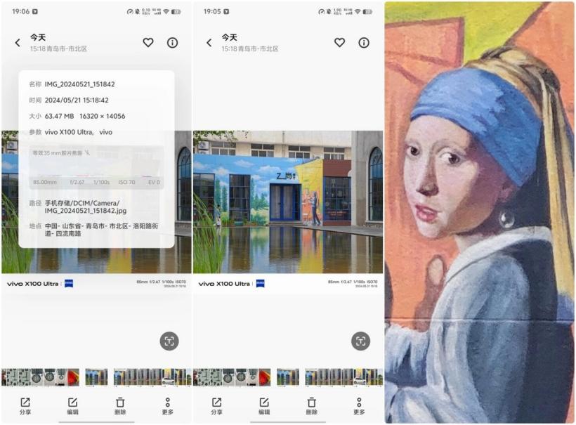 蔡司 2 亿 APO 超级长焦 Sensor HP9,vivo 在拍摄中还提供了 2 亿像素选项,当你用这颗镜头拍摄时,系统会自动识别场景,并在界面出现“试试 2 亿高像素模式”的选项。2 亿像素模式下,分辨率达到了惊人的 1630×14056,大小更是超过 50MB,但是 2 亿像素带来的超强解析力也是毋庸置疑的。右侧的少女壁画,即便是放大多次,仍保留了大量的细节。