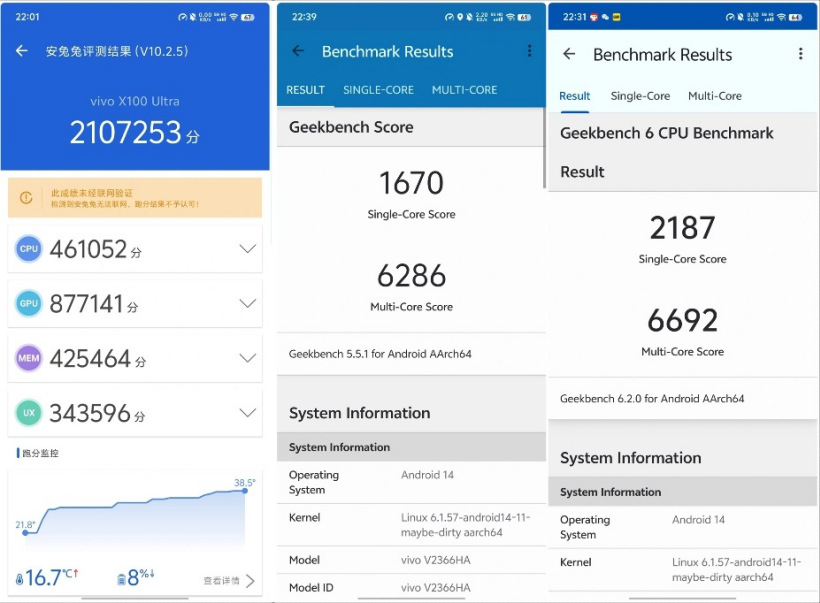 在第三代骁龙 8 的加持下,vivo X100 Ultra 在《安兔兔评测》中可以拿下 2107253 分的天花板级别成绩,其中 CPU 得到了 46 + 万的分数,GPU 则为 87 + 万分。而在 GeekBench 5/6 中,vivo X100 Ultra 单核能达到 1670/2269 分,多核则可以达到 6286/6871 分。