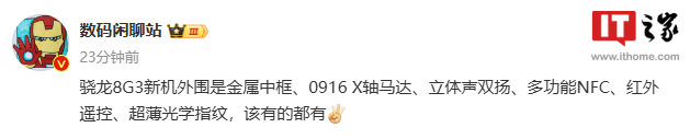 根据博主 @数码闲聊站 最新爆料,一加骁龙 8 Gen 3 新机提供金属中框、0916 X 轴马达、立体声双扬、多功能 NFC、红外遥控、超薄光学指纹。