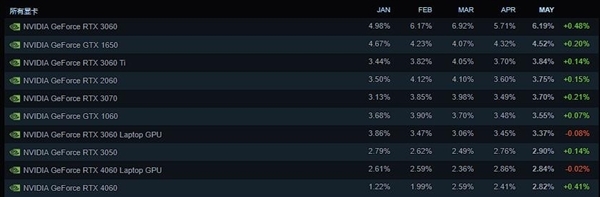 与此同时,GTX 1650、RTX 3060 Ti、RTX 2060和RTX 3070等显卡也表现出色,分别以4.52%、3.84%、3.75%和3.7%的占有比例位列榜单前列。