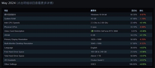 快科技6月2日消息,近日,Steam平台发布了2024年5月的硬件调查报告,详细揭示了当前游戏玩家的硬件配置趋势。