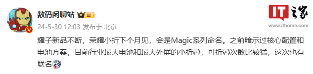 IT之家 5 月 30 日消息,博主 @数码闲聊站 今日爆料称,荣耀小折叠屏手机下个月见,以 Magic 系列命名,目前行业最大电池和最大外屏的小折叠,并且有联名款。
