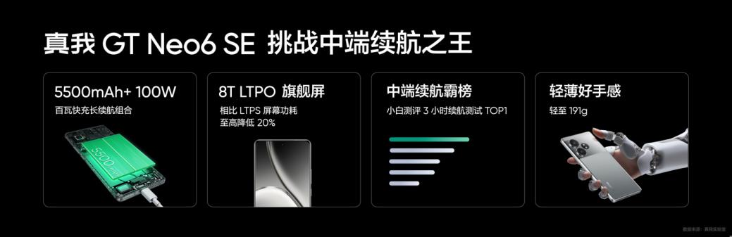 真我 GT Neo6 SE 内置 5500mAh 电池,搭载 SUPERVOOC S 电源管理芯片,DOU 续航测试达 1.92 天。采用超薄高能电池设计,全链路 GaN,手机轻至 191g。支持长寿版 100W 光速秒充,12 分钟充至 50%。