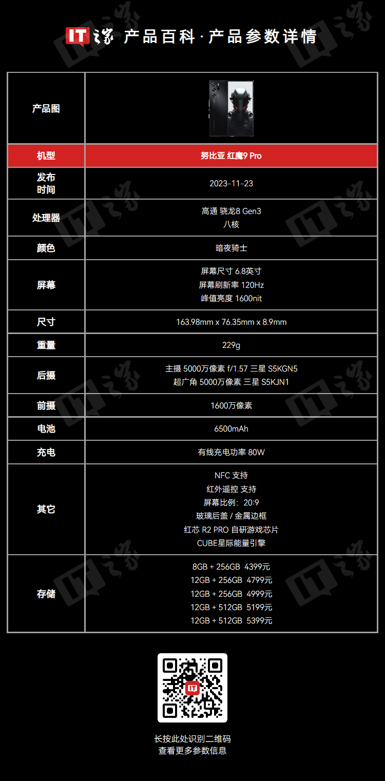 参考IT之家此前报道,红魔 9 Pro 系列号称“直板手机终极形态,行业唯一背部纯平旗舰”,采用 6.8 英寸第五代屏下“超竞全面屏”,搭载骁龙 8 Gen 3 处理器 + 满血版 LPDDR5X+UFS4.0,配备 6500mAh 电池 + 80W 快充,提供 3.5mm 耳机孔、游戏 3mic、全功能 NFC、红外遥控等特性。