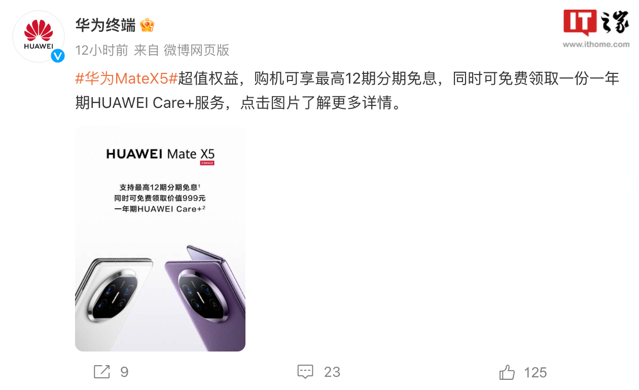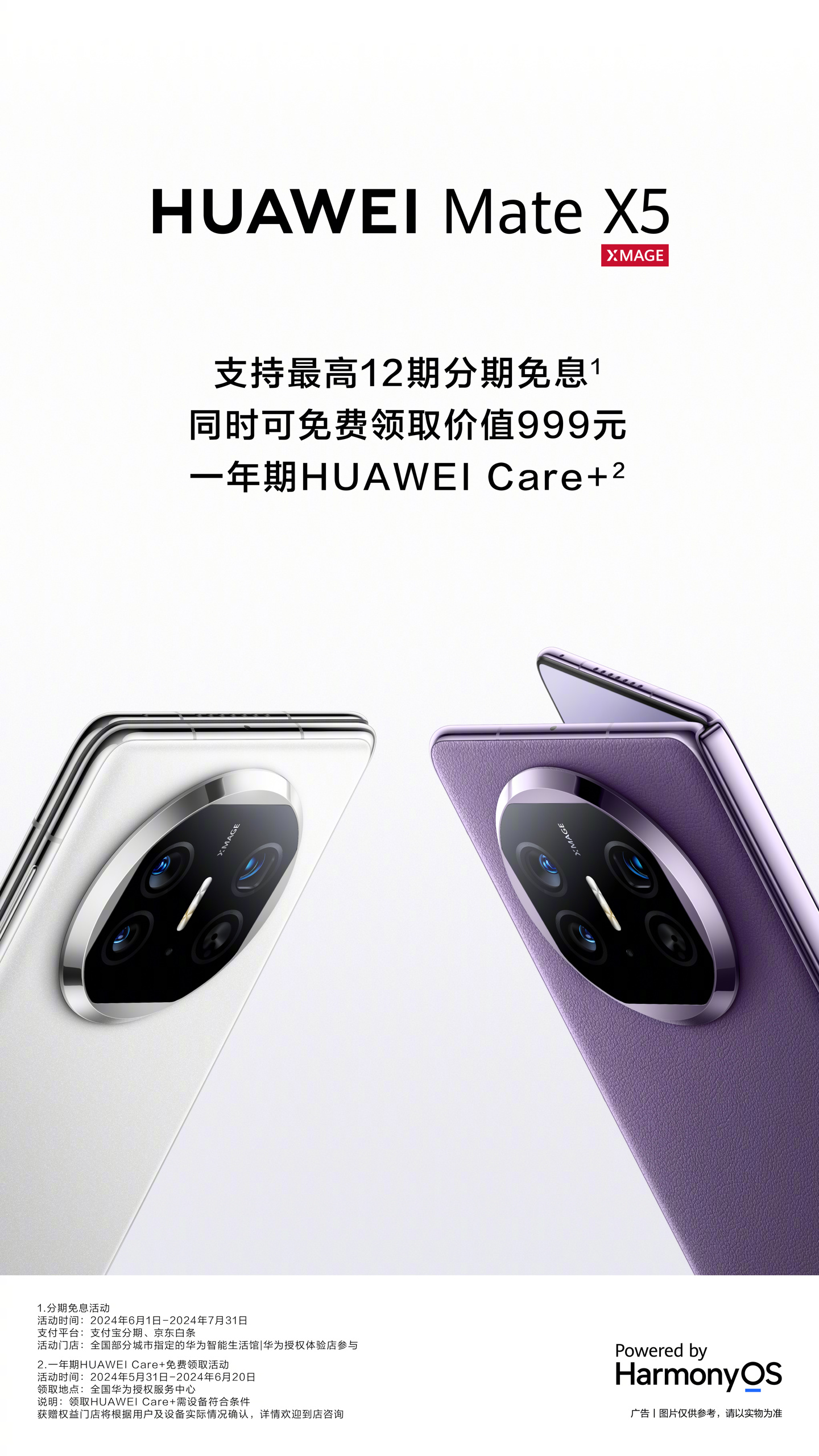 IT之家 5 月 31 日消息,华为官方今日宣布,购买华为 Mate X5 手机,限时享 12 期分期免息,并赠 1 年 HUAWEI Care+ 服务权益。