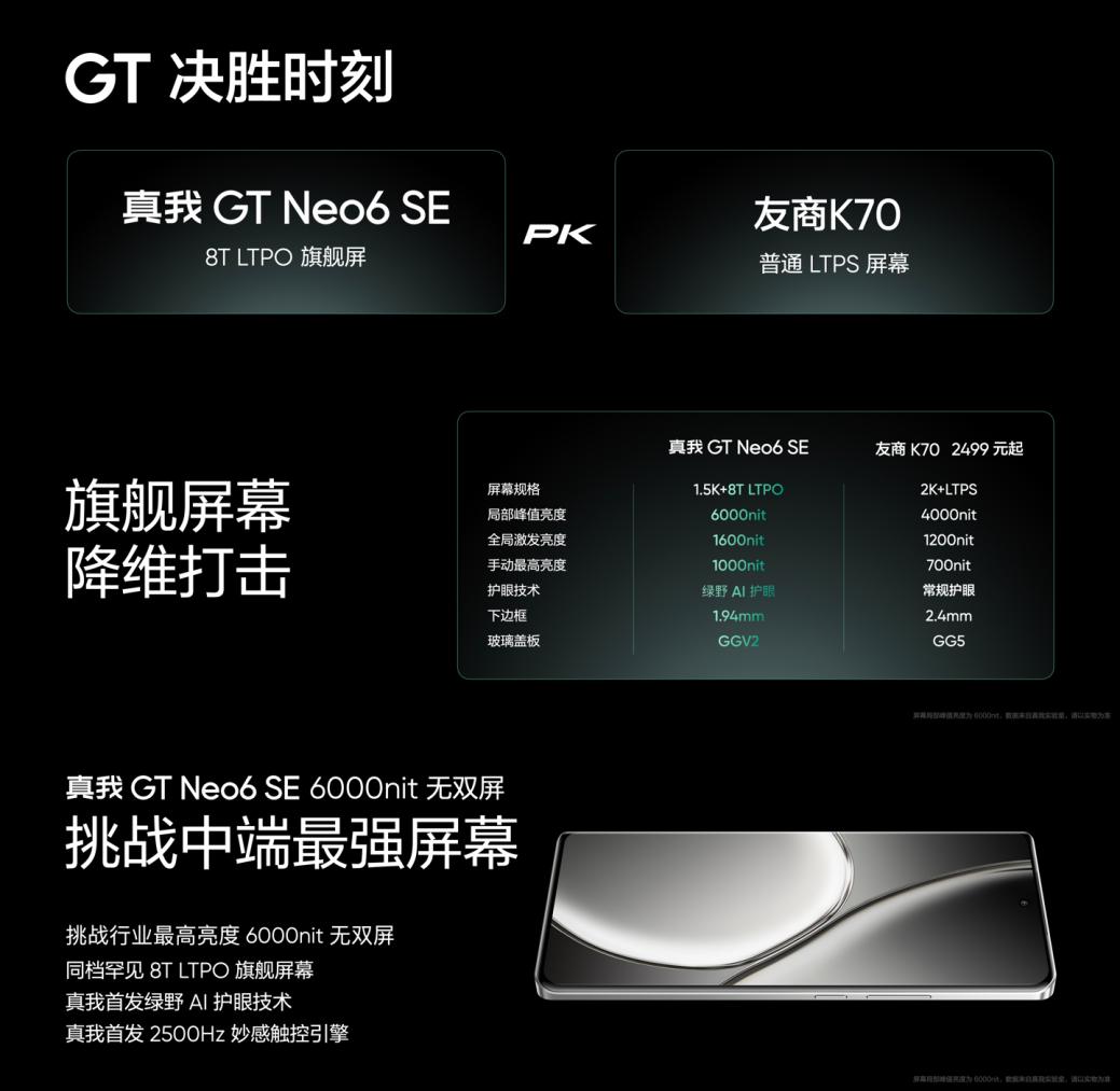 真我 GT Neo6 SE 首发京东方定制 6000nit “无双”柔性 OLED 屏幕,该屏幕 6.78 英寸 ,分辨率 2780×1264 ,拥有 1000nit 手动最高亮度、1600nit 全局激发亮度、6000nit 局部峰值亮度,支持 120Hz 刷新率(8T LTPO),2500Hz 瞬时触控采样率,支持 Pro-XDR 显示,使用了康宁 Victus 2 保护玻璃,边框窄至 1.36mm。