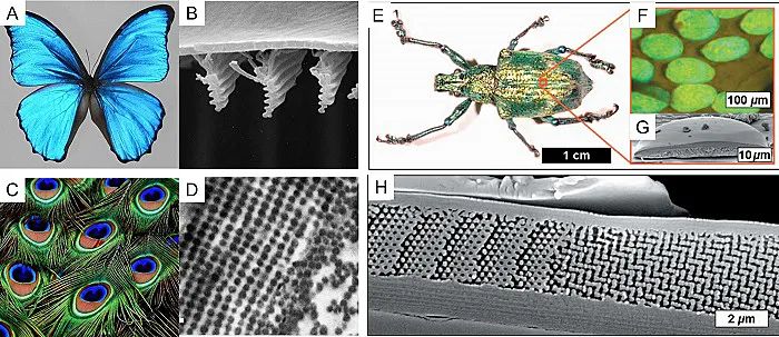 大家看到有一些五彩斑斓的宝石,还有自然界中蝴蝶翅膀、孔雀翎羽、甲虫外壳等闪烁着的彩色金属光泽,都源于光子晶体特殊的周期性微结构,能够对特定波长的光进行选择性反射。