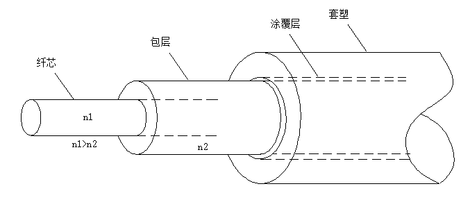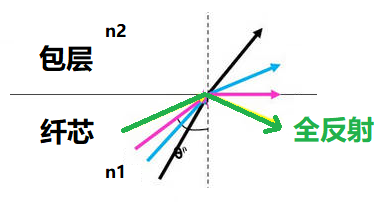 当光进入光纤,光纤纤芯的折射率 n1 比包层的折射率 n2 高,会发生全反射现象。然后光就会不停地反射,最终向前传播。
