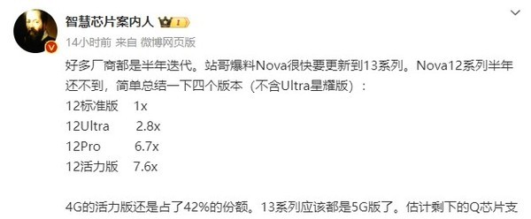 据数码博主称,华为nova很快会更新到13系列,“应该都是5G版”。其还曝光了nova 12系列约半年时间内的销量占比(不含Ultra星耀版):