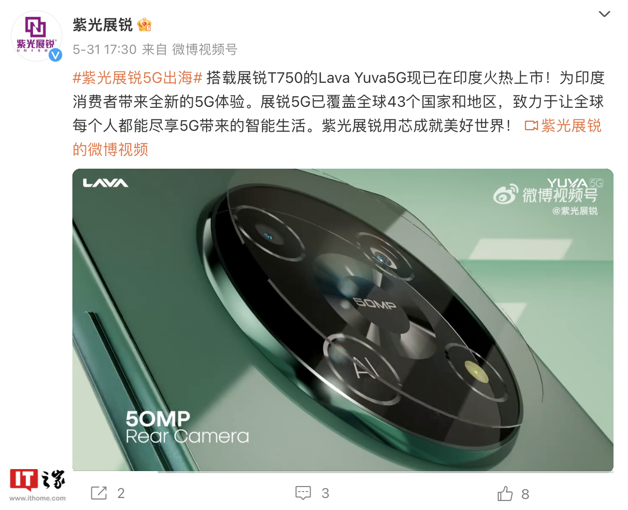 IT之家 6 月 3 日消息,据“紫光展锐”官方微博,紫光展锐 T750 5G 处理器近日再出海,目前已运用于在海外最新上市的 Lava Yuva 5G 手机中,号称可为印度消费者带来全新的 5G 体验,让全球每个人都能尽享 5G 带来的智能生活。