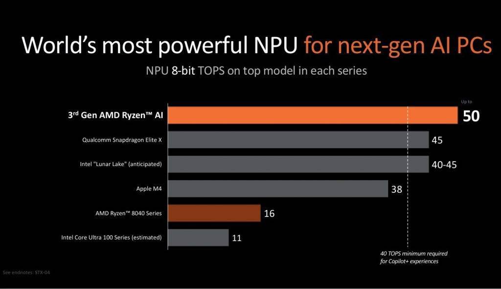 如果只看 NPU(神经网络处理器)性能,那 Ryzen AI 300 系列可谓「遥遥领先」,提供了 50 TOPS(万亿次每秒)的算力,不仅超过微软和英特尔制定的「AIPC」(现在是 Copilot+ PC)45 TOPS 的算力门槛,也问鼎移动端 NPU 算力。