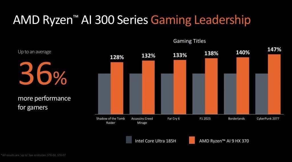 AMD 声称,在选定的游戏中,AMD Ryzen AI 9 HX 370 的性能表现比英特尔酷睿 Ultra 9 185H 要高出 36%,在具体游戏的表现中,《赛博朋克 2077》的差距最大,Ryzen AI 9 HX 370 比英特尔酷睿 Ultra 9 185H 要高出 47%。