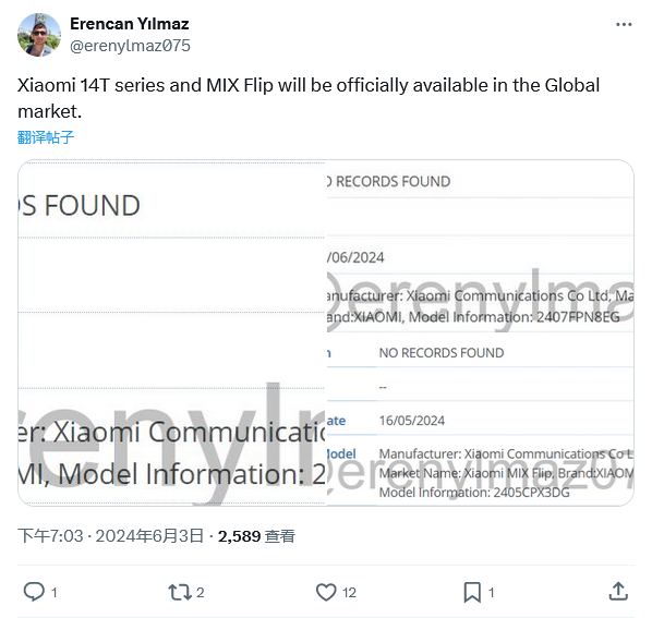 IT之家 6 月 4 日消息,消息源 Erencan Yılmaz 昨日在 X 平台发布推文,基于挖掘的数据库信息,小米将会推出国际版小米 14T 和 MIX Flip 智能手机。