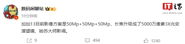 IT之家 6 月 4 日消息,博主 @数码闲聊站 今日发帖爆料:一加 13 将采用后置三摄方案,均为 5000 万像素镜头。