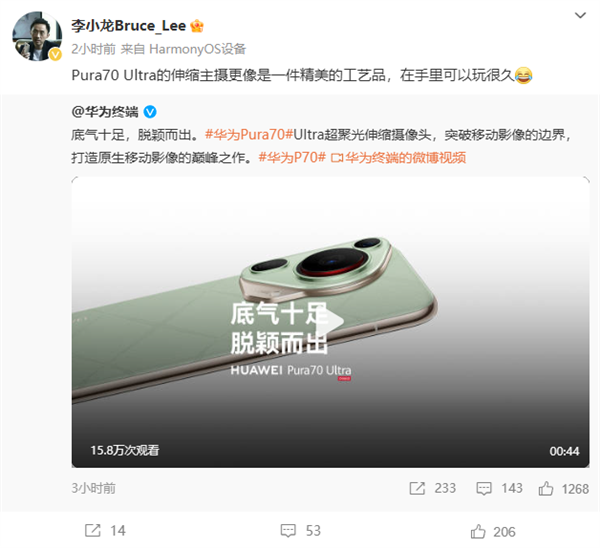 文章来源于互联网:快科技-华为Pura 70 Ultra首发超聚光伸缩主摄!华为李小龙:像精美工艺品