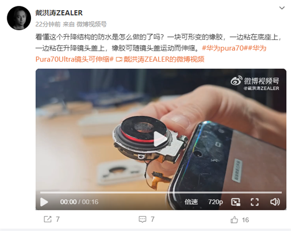与此同时,博主“戴洪涛ZEALER”也对华为Pura 70 Ultra进行拆解,不过,该博主更关注的是该机伸缩主摄。