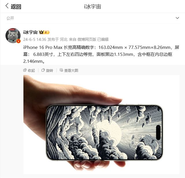 该微博内容如下:“iPhone 16 Pro Max 长宽高精确数字:163.024mm × 77.575mm×8.26mm,屏幕: 6.883 英寸,上下左右四边等宽,面板黑边 1.153mm,含中框在内总边框 2.146mm。”