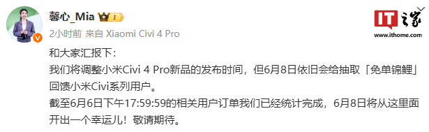 IT之家 6 月 6 日消息,小米 Civi 产品经理胡馨心今日宣布,公司将调整小米 Civi 4 Pro 新品的发布时间,此前公布的「免单锦鲤」的活动依旧会在 6 月 8 日抽取。