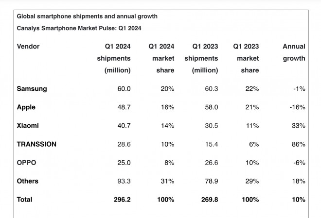 根据 Canalys 最新报告,2024 年第一季度全球智能手机出货量达到 2.962 亿部。这一数字代表着同比增长 10%,并且是过去十个季度中首次出现两位数增长。