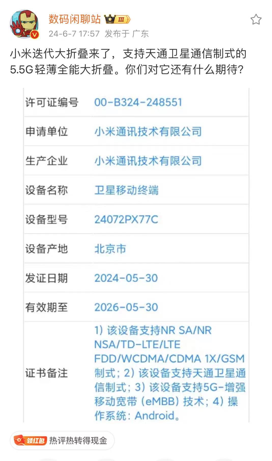 文章来源于互联网:凤凰网-小米MIX Fold 4“卫星移动终端”通过工信部入网审查,支持5.5G网络