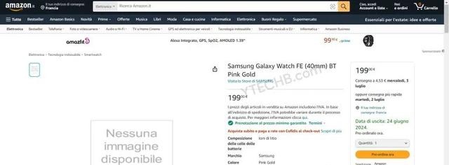 IT之家 6 月 8 日消息,三星 Galaxy Watch FE 智能手表已经在亚马逊意大利电商网站上偷跑,有黑色、银色(此前曝光的渲染图为蓝色)和粉金色三种颜色可供选择,售价为 199 欧元(IT之家备注:当前约 1565 元人民币)。