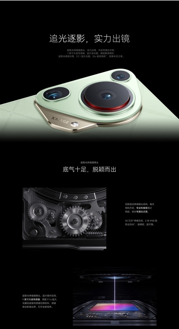 华为Pura 70 Ultra创新性采用超聚光伸缩主摄,搭载1英寸大底传感器、以及超大的F1.6物理光圈,同时业界首创旋动伸缩镜头结构,通过旋转导轨传动系统,让镜头在启动拍摄时自动伸出,实现更大的镜内空间,从而在厚度仅为8.4mm的机身空间内实现1英寸大底和F1.6大光圈。